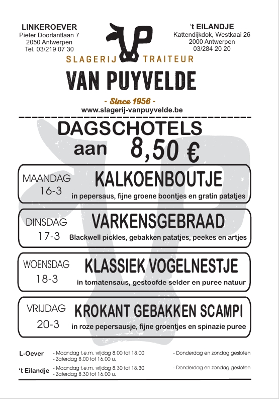 De derde generatie is meteen een feit en linkeroever mag zich opmaken voor nog vele jaren extra van kwaliteitsvlees traiteur, salades, charcuterie, enz… Richard is zich nu aan het bekwamen in de slagerij van vader Jo en bij Luc De Laet, van de gelijknamige slagerij te Hove, collega en vooral vriend des huizes Van Puyvelde. Bij Slagerij De Laet kan Richard zich verder specialiseren in nog meer en nog beter dan het nu al is. Vernieuwend, innovatief, creatief en ambitieus met veel kwaliteit zijn trouwens altijd de troeven geweest bij Slagerij Van Puyvelde